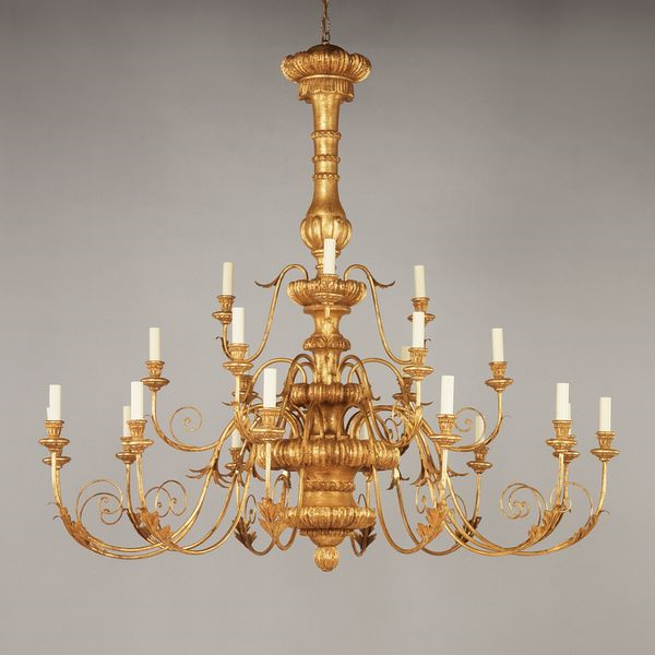 French in style, this chandelier is both grand and multi-tiered. The hand-decorated gilt finish adds texture and charm. The upward-curving arms are finished in fine leaf detailing, complementing the ornate central body.