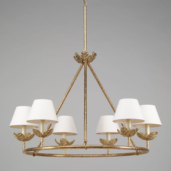 Inspired by a French antique, this chandelier features distinctive sculpted leaves. Defined by the circular frame and crown of leaves at the top, the hand-applied pitted metalwork adds texture to this characterful, contemporary piece.