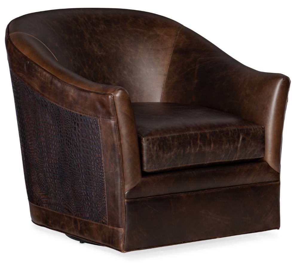 Product Description: With flared arms, a modern tub shape and contrasting solid leather accented by a novelty animal patterned leather, the Morrison Swivel Club Chair puts the spotlight on comfort. The contrasting leather covers are Columbus Chocolate and Nile Croc, both high-quality anilines.