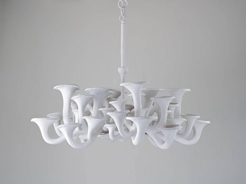 Organic and sculptural in its form, the Mushroom has found its true incarnation as a ceiling light. Using the most up-to-date techniques, the Mushroom is 3D printed in a sustainable composite, layered with plaster, softly hand textured and painted, before being fitted with small LED bulbs.