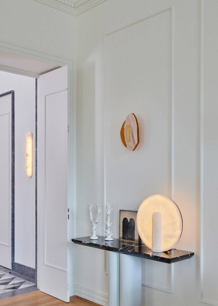 With their soft backlighting, MY wall lights are a powerful expression of alabaster’s mineral nature. Elegant and minimalist, they are composed of two fine alabaster elements joined together in perfect symmetry by a black steel rod. Each element offers a diffused radiance in a play of light. Sleek and discreet in design, our MY wall lights blend harmoniously into a refined decor of natural wood and stone. They’ll give character to your entrance or hallway.