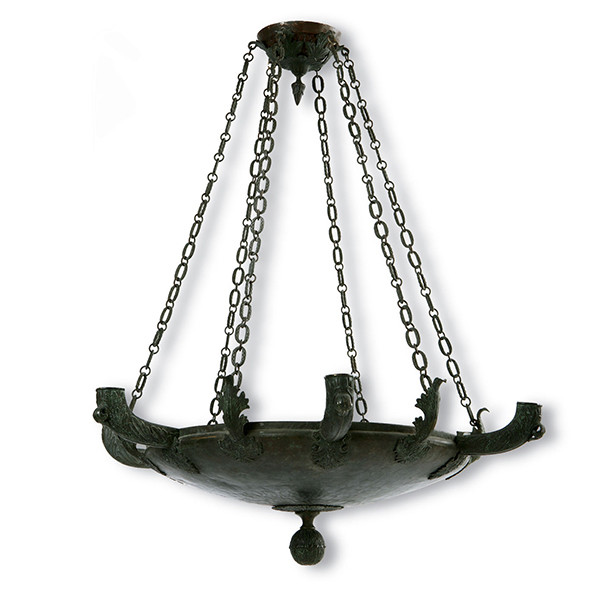 Six-arm candelabra fixture, hand cast in bronze. Wired with UL approval for six 25 watt candelabra bulbs. Waxed candlesleeves. Ceiling canopy with filigree chain. Weighs 26 lbs.