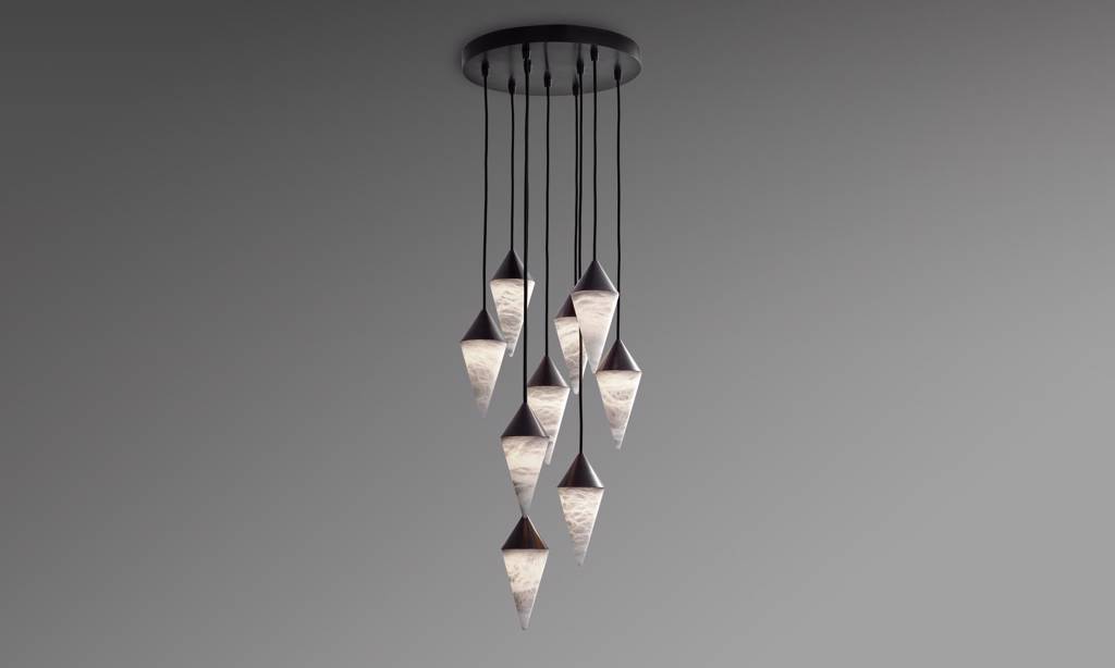 Nine hand-carved alabaster pendants make an illuminating statement for your interiors. Designed by Schuyler Sweet.