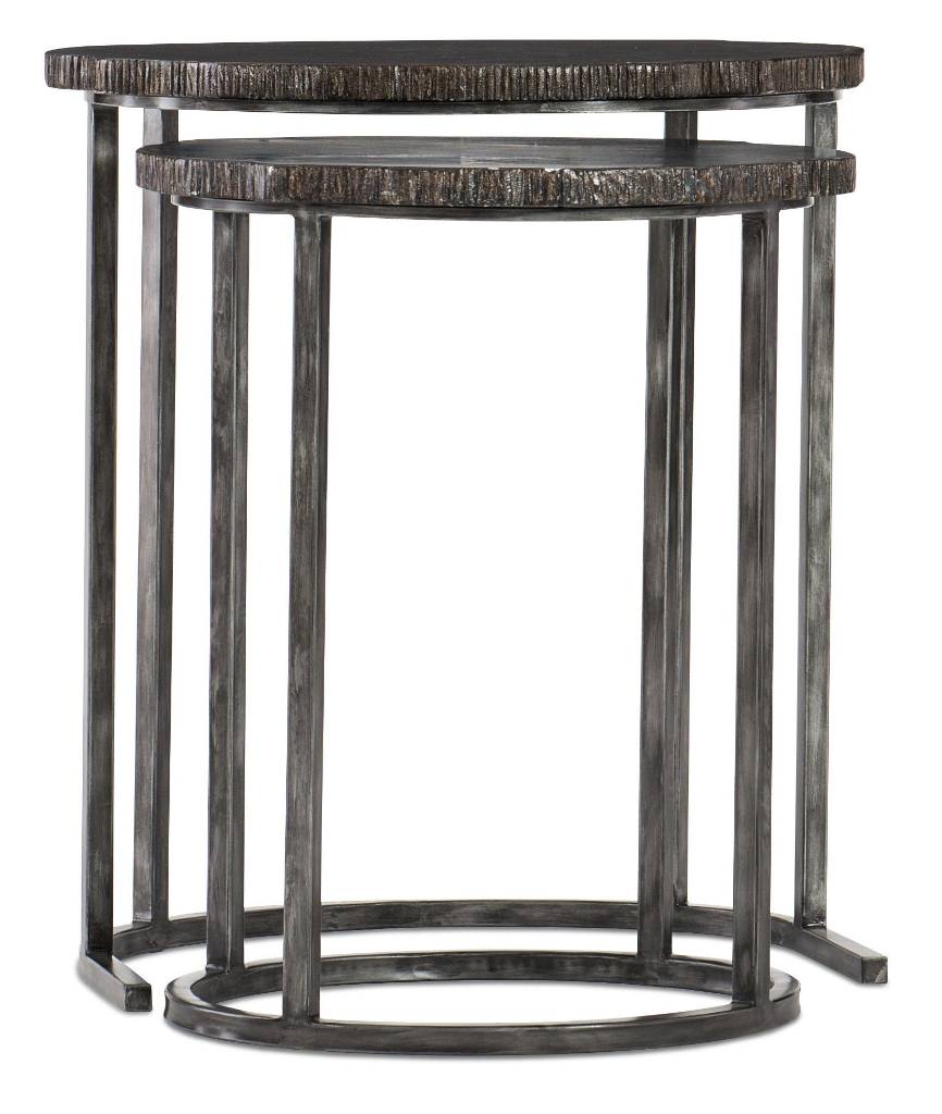 Product Description: These clever, chic and casual nesting tables crafted of hardwoods and metal with painted wood tops are just what you need to tuck beside your favorite chairs in multiple spaces in your home. The large table is 23 ½ wide x 18 deep x 26 ¼ high, while the smaller table measures 19 ½ wide x 15 ¼ deep x 24 inches high