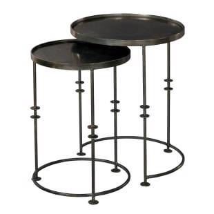 Two round metal top tables with slender round metal legs with decorative art deco metal discs.Top has a raised edge along the circumference.Black Nickel finish on iron.Large Width 18.75" (47 cm)Large Depth 18.75" (47 cm)Large Height 24" (60 cm)Medium Width 15.5" (39 cm)Medium Depth 15.5" (39 cm)Medium Height 22" (56 cm)