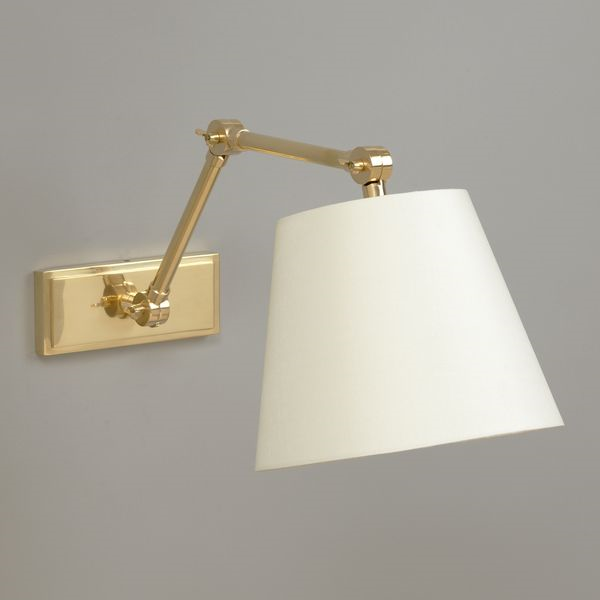 This library light is defined by its horizontal backplate and adjustable upturned arm allowing for a variety of lighting positions.Brass (Fabric Shade)