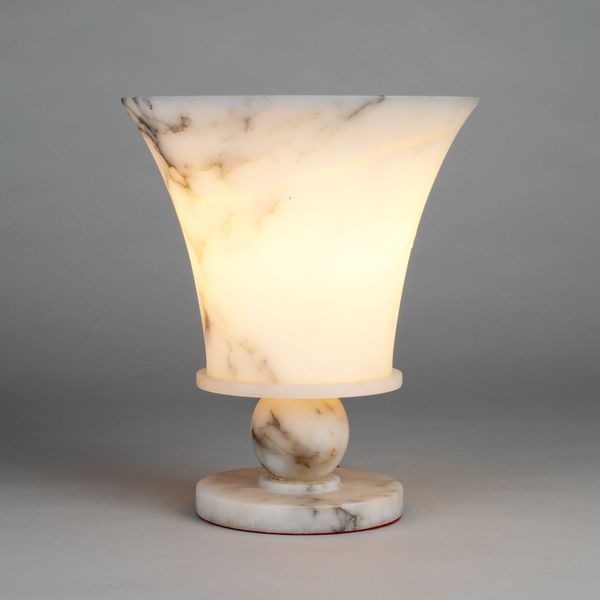 This alabaster uplighter has a flared goblet shape, inspired by a mid-century design. The alabaster is naturally translucent, emitting a diffused light when illuminated.