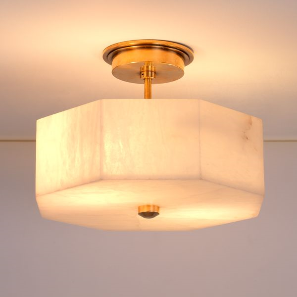 Defined by its octagonal-shaped alabaster bowl, this piece gives a subtle glow when lit.Brass