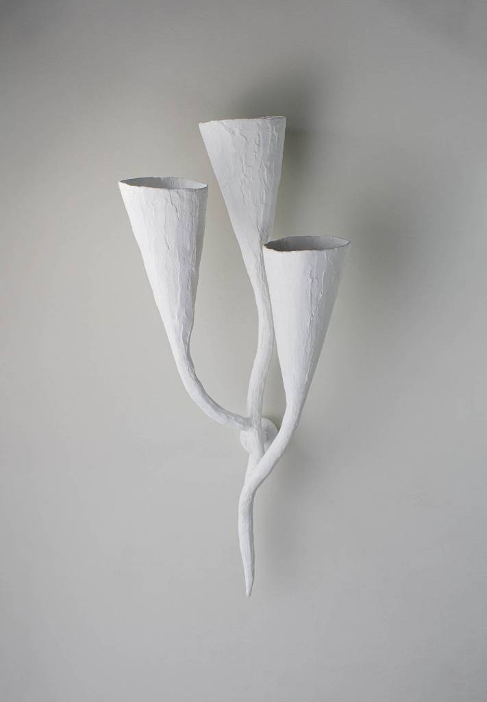 Each Ophelia Wall Light is individually handmade. Its twisting white flutes emit a golden light, which is diffused and softened by the sculptural surface and Plaster White finish.
