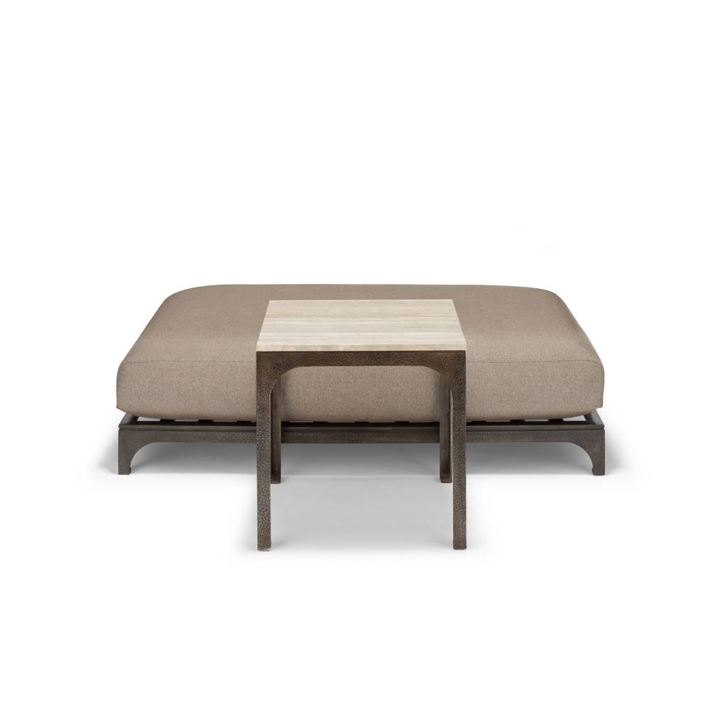 Nimmo was looking for luxurious, handmade outdoor furniture when he designed the Opio line. The Opio Bench features a hand-hammered iron base, as well as a loose seat cushion.