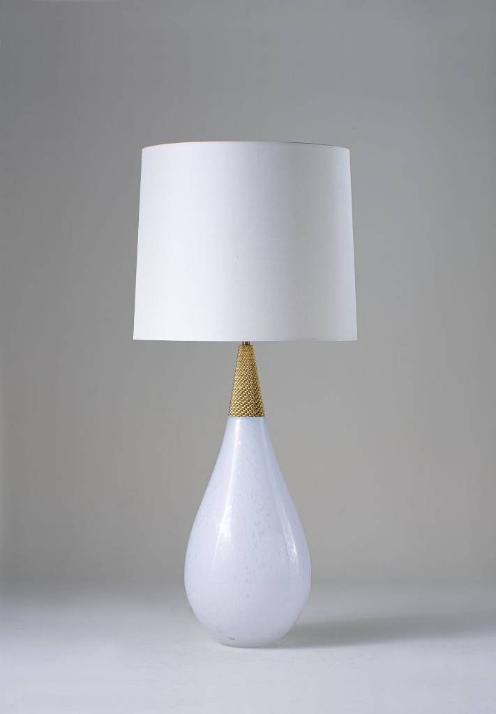 To achieve the smooth drop shape of the Pearldrop Lamp, the glass has been mould-blown. The piece is made in bubbled milk glass, creating a luxurious opaque finish and paired with a collar painted in our workshop.