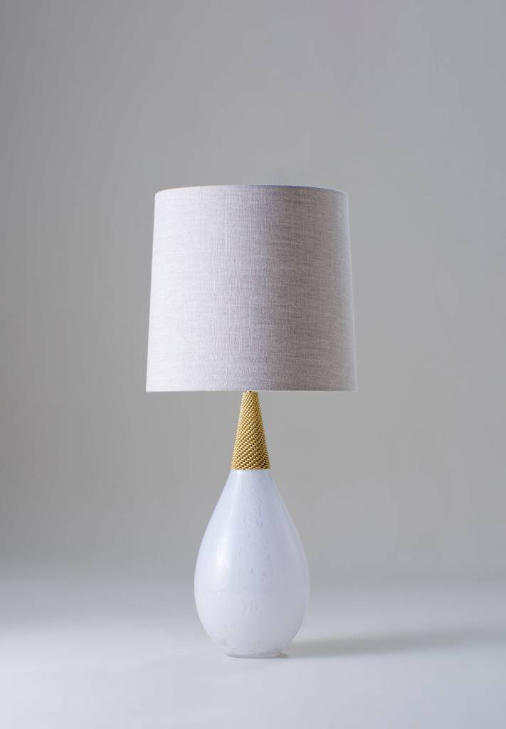 To achieve the smooth drop shape of the Pearldrop Lamp, the glass has been mould-blown. The piece is made in bubbled milk glass, creating a luxurious opaque finish and paired with a collar painted in our workshop.