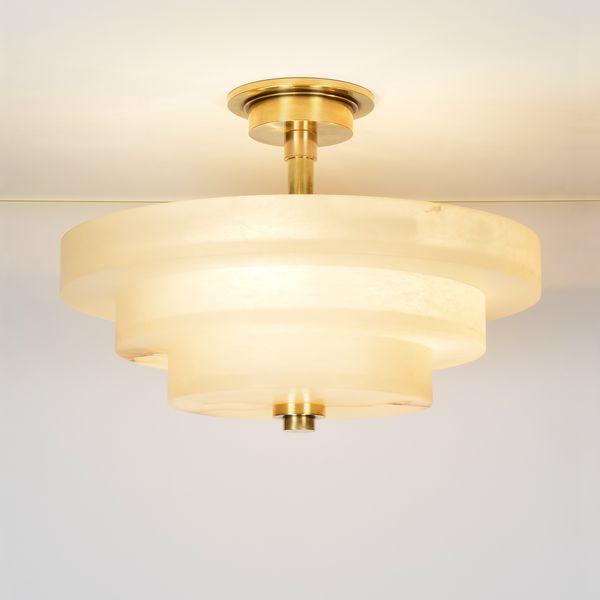 Inspired by a 1930s Art Deco antique, this design is large in scale. The hand finished stepped alabaster bowl pairs beautifully with the round finial and ceiling plate.Brass (Small)