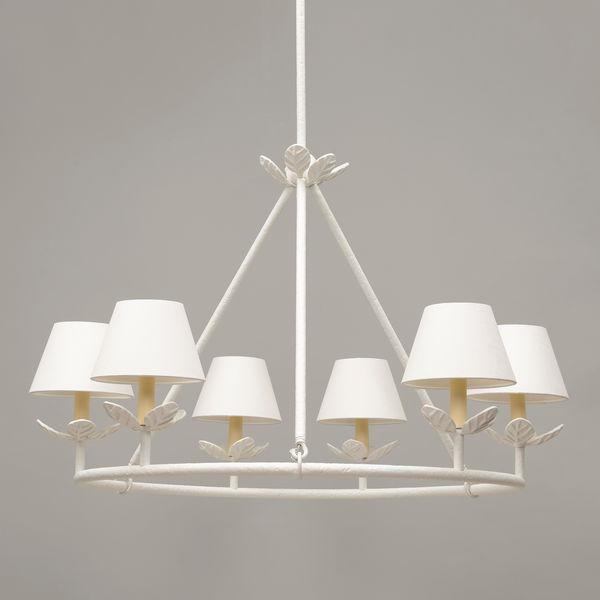 Inspired by a French antique, this chandelier features distinctive sculpted leaves. Defined by the circular frame and crown of leaves at the top, the hand-applied pitted metalwork adds texture to this characterful, contemporary piece.
