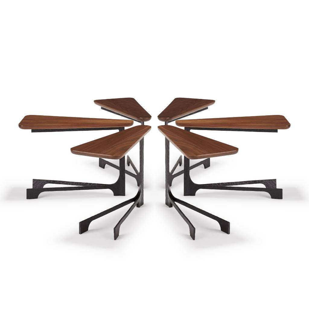 These small, lightweight side tables are designed to look like individual flower petals. A group of these tables pushed together in a circle looks like a flower. The base of the Pinguino Side Table was inspired by Nimmo’s Cruz (cross) design and made in hand-hammered iron. The top is wood.