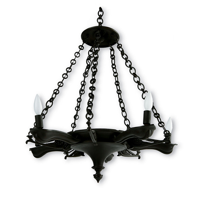 Description : Cast bronze chandelier. Wired for UL approval with five 25 watt candelabra bulbs. Waxed candlesleeves. Ceiling canopy with 3' filigree chain. Finish : Dark Bronze