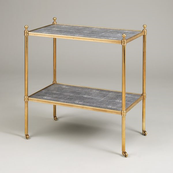 Based on a Regency piece, this table retains a timeless quality. A classic occasional table, the pairing of brass or nickel with glass, mirror or faux shagreen makes this such a collectible piece.