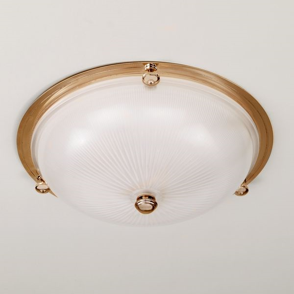 Based on a simple and distinctive line, this light is replete with details, from the brass finials that hold the glass in place to the delicate spear-cut pattern on the bowl. When illuminated, it diffuses light around the room.