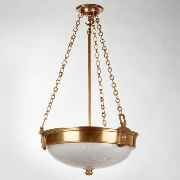 This design is understated in style yet features decorative details. The spear-cut design in the frosted glass bowl unites with the simple brass surround and finial.Brass