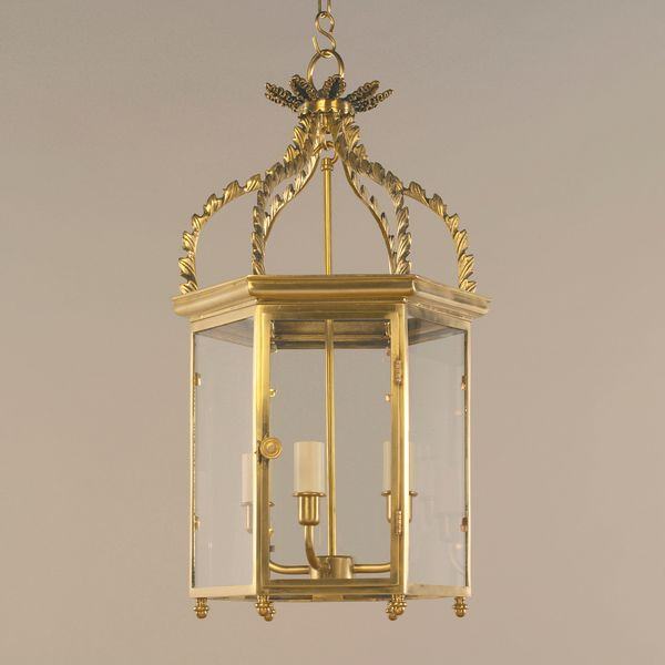 This classic lantern is based on a 19th century six-sided original. Superbly cast, it demonstrates a range of techniques, from the finely crafted frame to the ornately decorative upper section, finished with feathered detailing and a leaf-like top coronet.