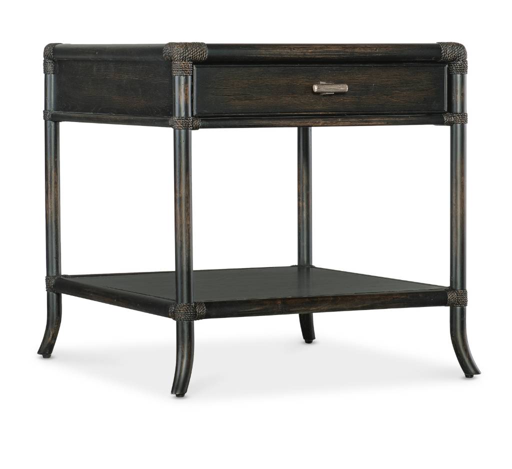 Product Description: Inspired by tropical getaways, the Retreat Pole Rattan End Table is a mixture of natural materials in a laid-back, versatile design. Crafted of Oak and Maple Veneers with Rope accents at the joints, the table is finished in Black Sand, transparent by design to showcase the unique grain patterns of the wood veneer. Finished on all sides, the table has one self-closing drawer, one fixed shelf and is accented by soft pewter-colored “T” pulls.