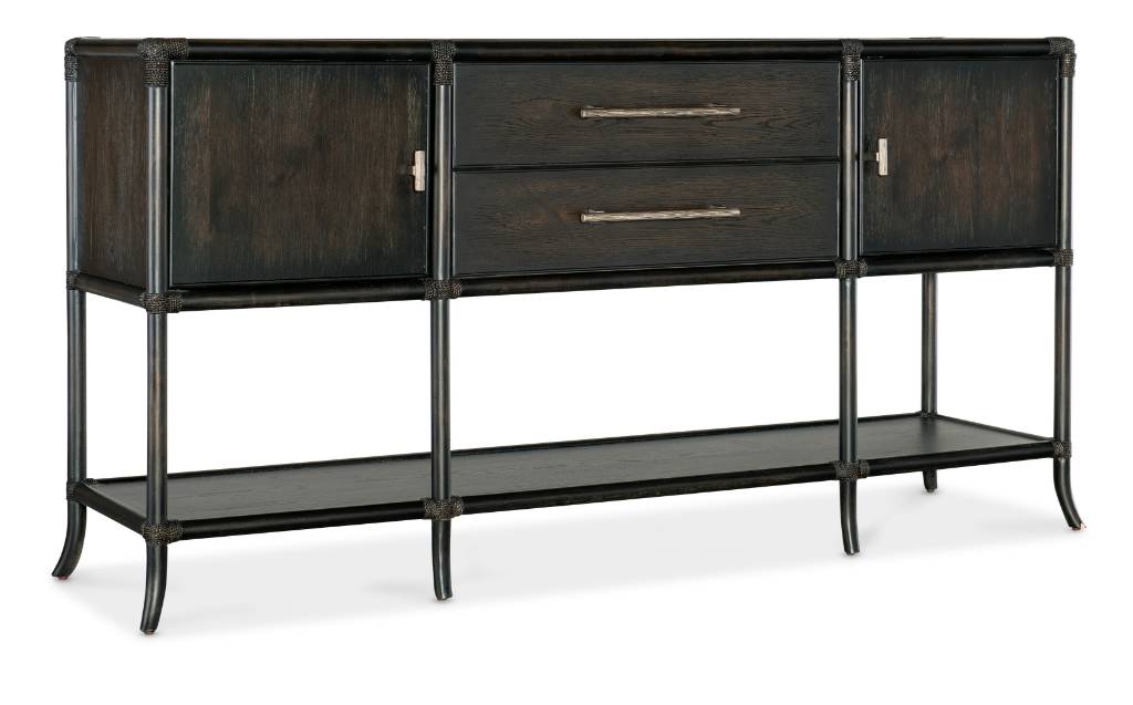 Product Description: With a laid-back island vibe and mix of organic materials, the Retreat Pole Rattan Sideboard is crafted of Oak and Maple Veneers with rope accents at the joints. The Black Sand finish is transparent by design to reveal the unique grain patterns of the wood veneer. Featuring ample storage, the sideboard has two doors with magnetic door catches with one adjustable shelf behind each door. There are two self-closing drawers, and the top drawer has a removable felt liner and removable silverware tray. The lower fixed shelf is ideal for display or storage. Soft pewter bar pull and “T” pulls on the doors add a distinct accent.