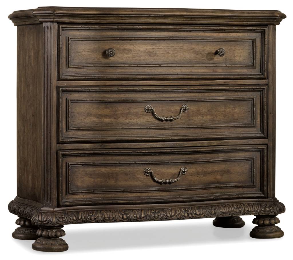 Product Description: The Rhapsody Bachelors Chest brings together classic style elements and a relaxed, rustic finish in an impassioned marriage of casual opulence. Exuberant design motifs such as an acanthus leaf molding around the base, column motifs on the case and ornate bun feet infuse the piece with emotion. The walnut-colored finish is inspired by the rustic nature of reclaimed woods in beautiful patinas. Three drawers, including a cedar-lined bottom drawer. On the back is a convenient receptacle for use with electronic devices.