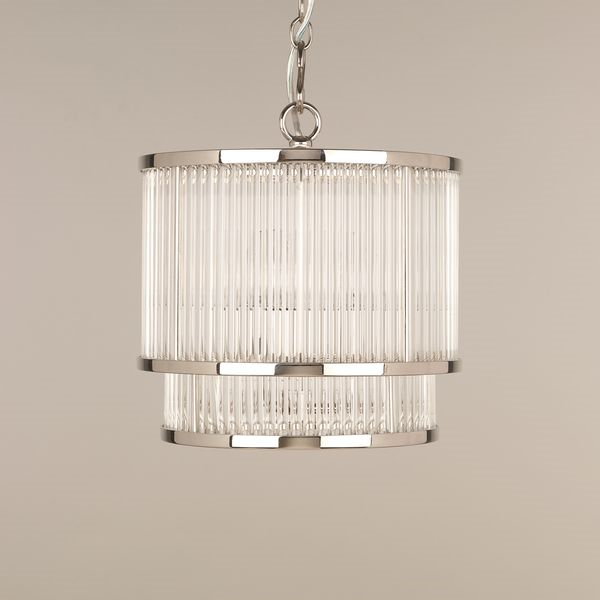 This ceiling light reflects the ethos of modern style, with its clean lines and understated elegance. Individual glass rods cascade from a circular frame to create a truly refined fixture.Nickel