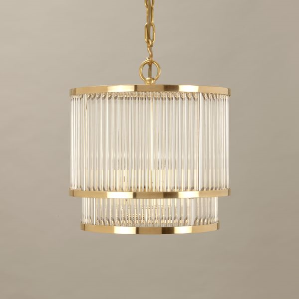 This ceiling light reflects the ethos of modern style, with its clean lines and understated elegance. Individual glass rods cascade from a circular frame to create a truly refined fixture.Brass