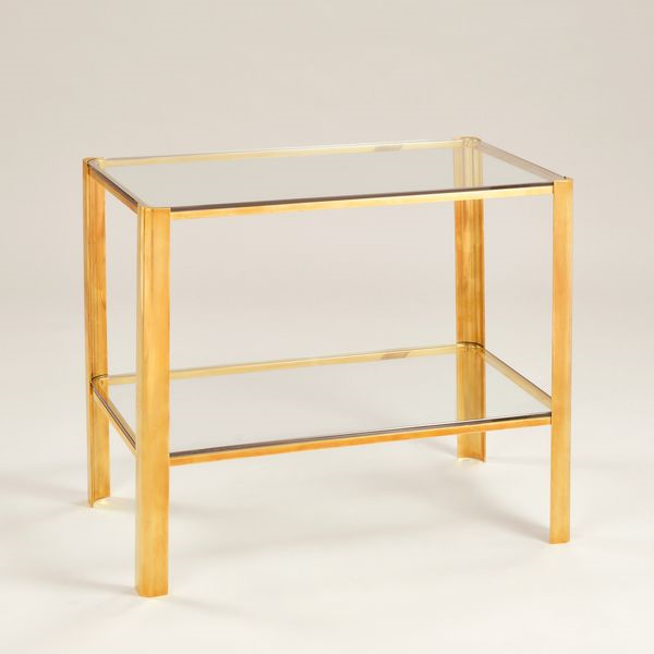 Based on a 1950s design, this table has strong concave legs with a distinctive rounded edge and curved corners. The thick glass shelves add to its solid design.Brass (Glass Table Rectangular)