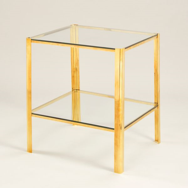 Based on a 1950s design, this table has strong concave legs with a distinctive rounded edge and curved corners. The thick glass shelves add to its solid design.Brass (Glass Side Table Square)