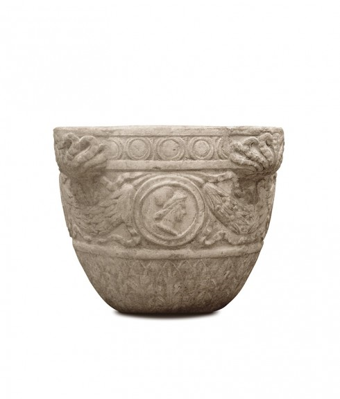 overall dimensions: 14”dia x 10”h interior at top: 7¾”dia x 8”h interior at bottom: 4½”dia x 8”hindoor/outdoorstandard size only28 lbsantique stonecast stone