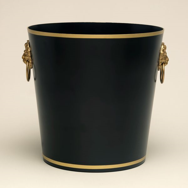 This waste paper basket has a painted tole metal base and is finished with lion mask handles in gilt.Black