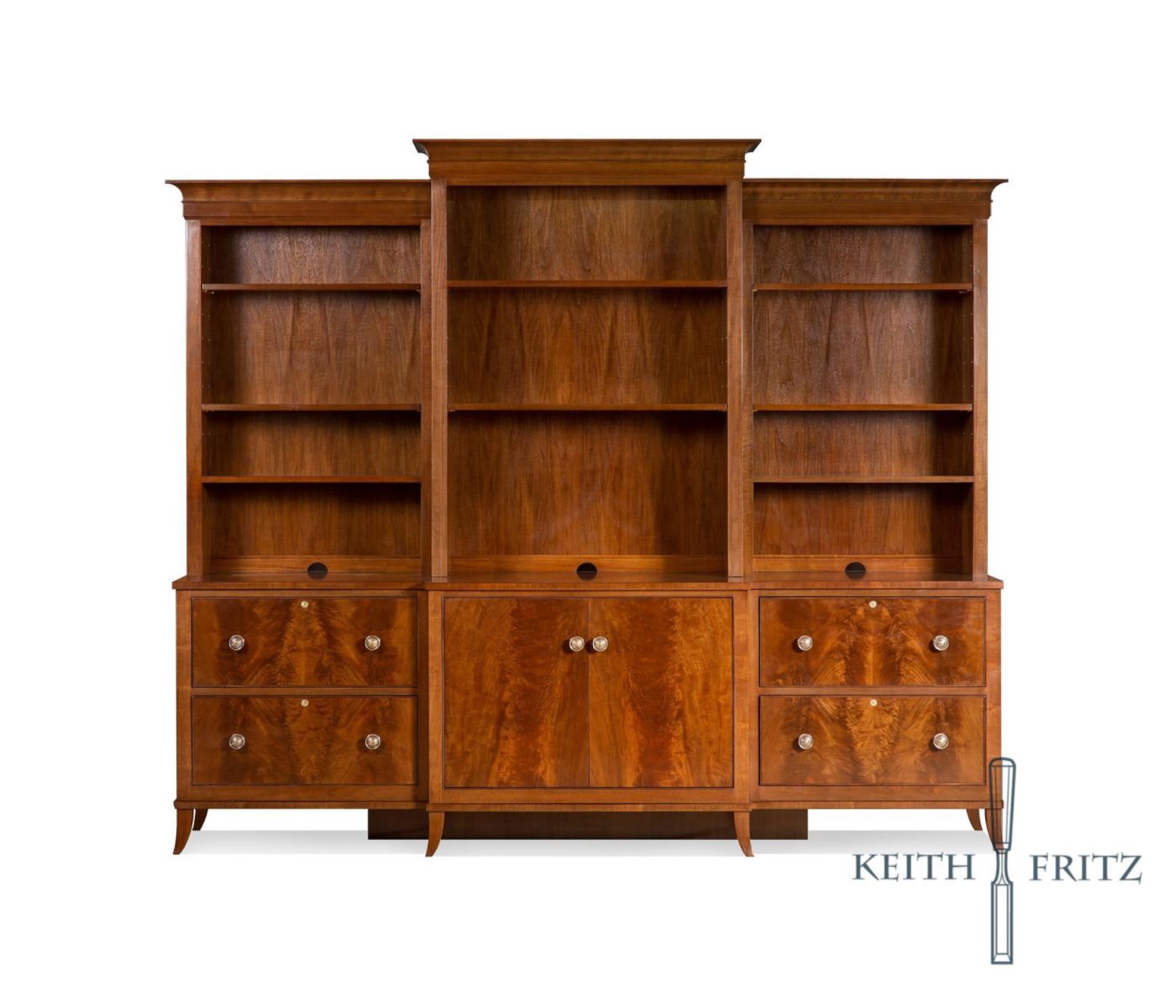 This multi-purpose breakfront is designed for either a home office or an entertainment center. It has four generous file size drawers and the center has retractable pocket doors capable of holding and hiding media and stereo components. The piece is named for its saber feet and crown with sweeping curves. The drawers are solid walnut with hand cut dovetails as with all drawers by Keith Fritz.