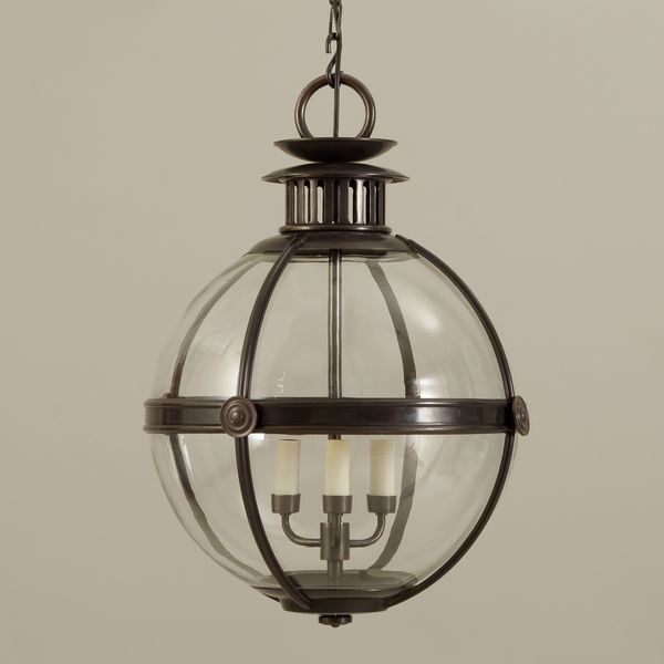 Inspired by a 19th century antique, this globe ceiling light has three lights. The hand-blown glass sphere emanates strength and is complemented by the bronze finish.Bronze