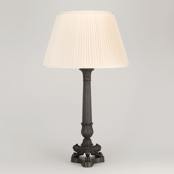 Inspired by a French antique sinumbra oil lamp, dated 1825. The original lamp had three lights and we reinterpreted the design with a single light for a more refined feel. The tripod base works beautifully with the monopodia-style feet.