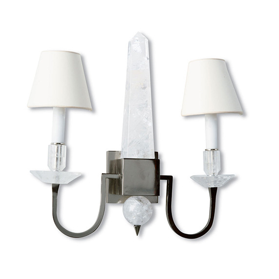 Description : Double armed sconce with hand-carved rock crystal obelisk, slid orb and bobeche. Finish : Polished Nickel