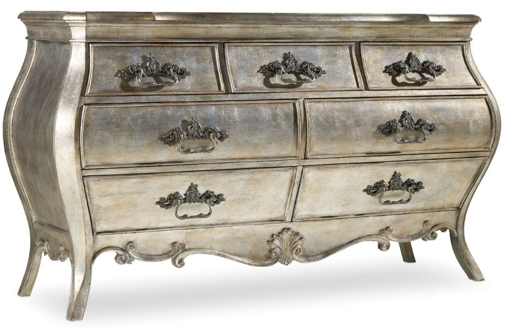 Product Description: With its soft, curvy, Bombay-like shape and elegant Silver Leaf Bardot finish with a slightly aged patina, this is a treasure chest of a dresser to enchant your master suite. The opulent hardware is inspired by an 18th Century French antique. The top drawers are felt-lined, and the bottom drawer is lined in cedar. Crafted of Hardwood Solids and Cedar and Birch Veneers.