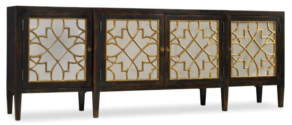 Product Description: Give your home a jolt of energy with this feel-good, exquisitely-styled four-door console adorned with antique mirror and gold leaf fretwork and finished in a contrasting Ebony, a hand-rubbed black providing drama and contrast.