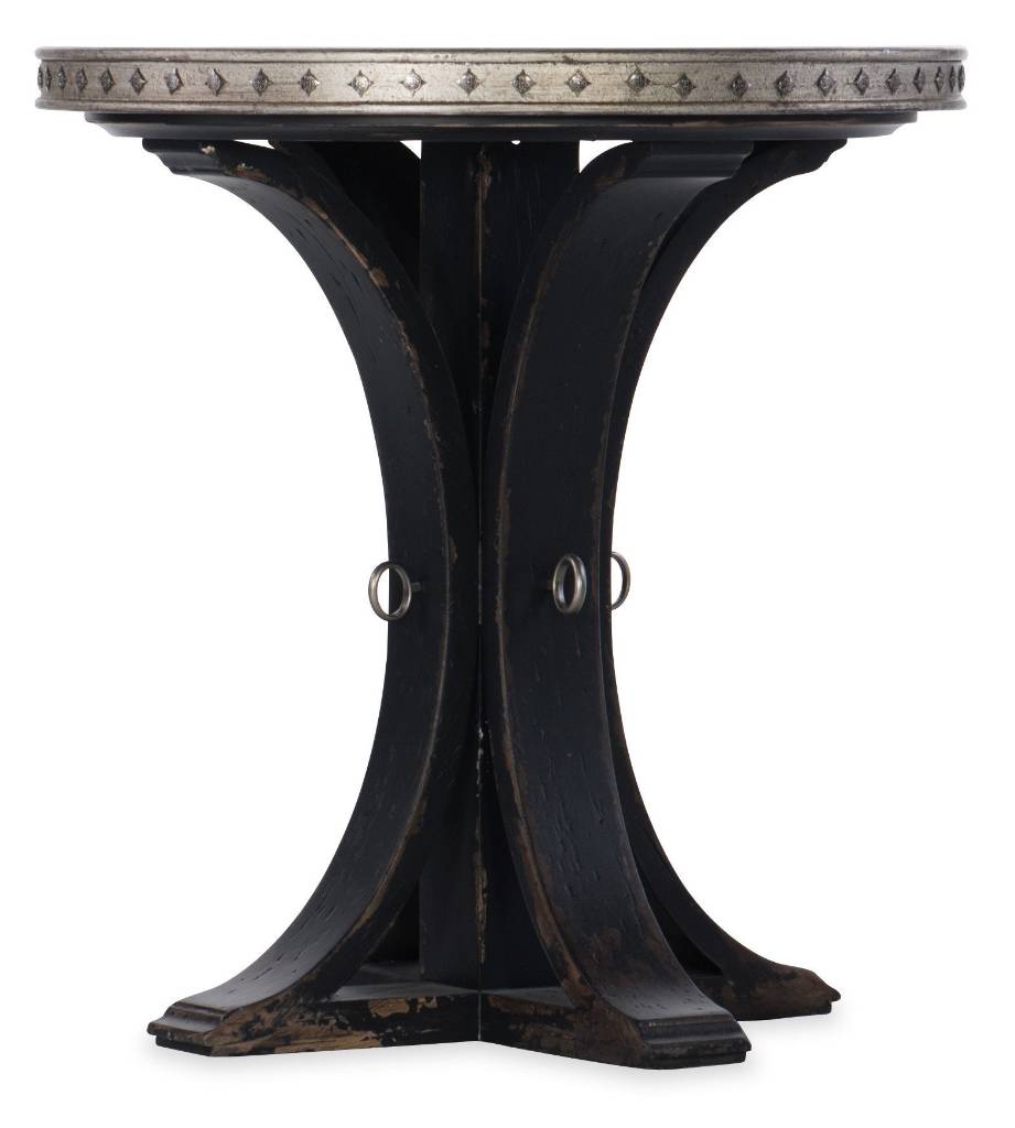 Finish: The base is Porte Noir, a dark, black painted finish rich brown undertones, rubbed to a medium sheen, with areas of heavy rub thru and distressing to review a honey tone wood color. The top is Jewel, a silver finish with rich undertones of gold and champagne. Distressing includes gouging and worm holes. Decorative medallion trim are goldish silver. Decorative rings on base are antique silver metal.