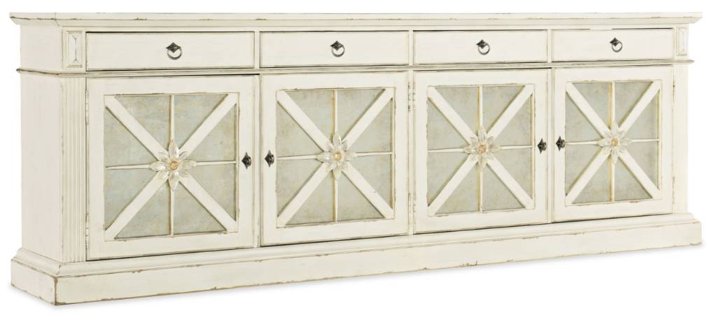 Product Description: With a Neoclassical pedigree, the Sanctuary Blanc Entertainment Console is updated with a casual sophistication and soft, inviting finish. As practical as it is pretty, the console has 4 doors with 2 adjustable shelves behind each pair of doors, 4 drawers and a ventilated back panel, along with the 3-plug electrical outlet. Crafted of Poplar and Hardwood Solids with Oak Veneers and shimmering eglomise glass panels on the door fronts, the console is finished in Blanc, a creamy white finish accented with champagne and silver tipping. The metal pulls are in an antique silver color. Accommodates up to an 80-inch TV.