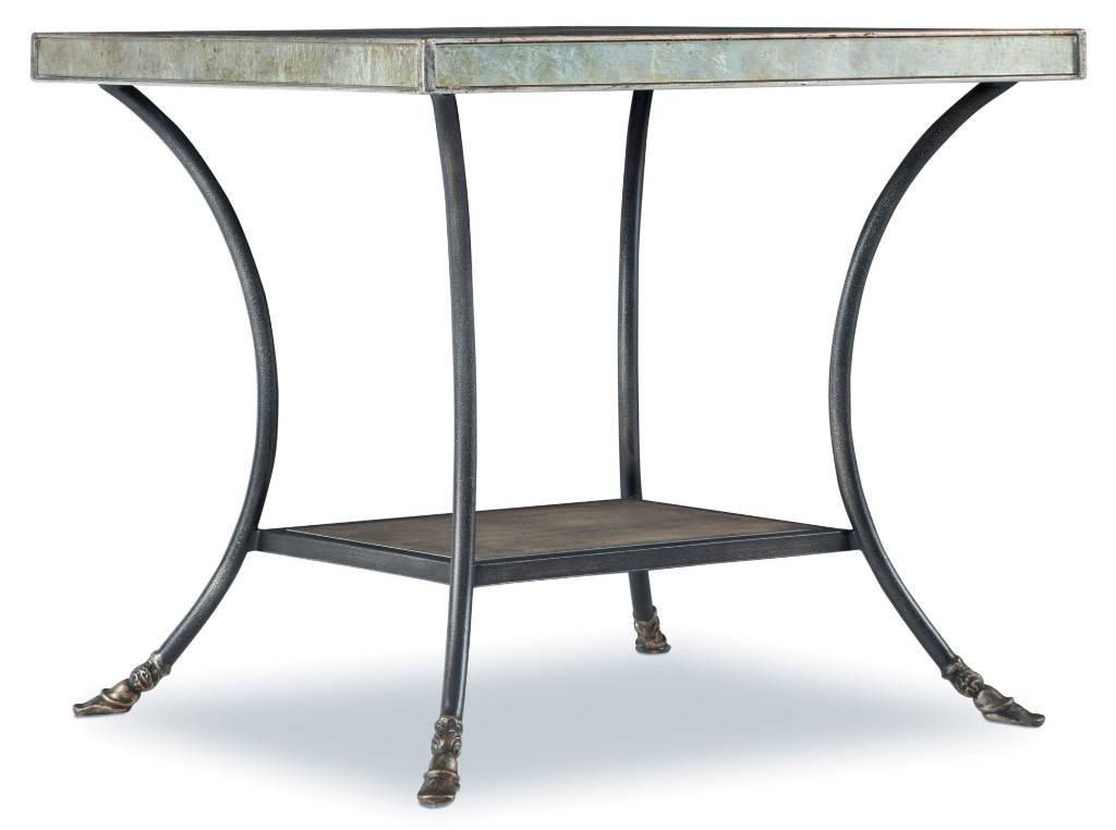 Product Description: With delicate curved lines and shimmery style, the Lisette End Table sets a glamorous, light and airy tone for your room. In a compact rectangle shape, the table has one fixed shelf and is crafted of Poplar and Hardwood Solids with Oak Veneers and Glass. Contrasting finishes are Jewel, a silver with rich undertones of gold and champagne and Metal Noir, a dark antiqued metal. An Heirloom aged eglomise mirror top adds the final panache.