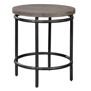 Round end table featuring solid mango slab top supported by a structure of round iron legs with iron circular stretchers.The wood top offers an appealing aged look which combines oil-rubbing with applied highlights of gray and white glaze.The metal frame has an Aged Iron finish.Width 22" (56 cm)Depth 22" (56 cm)Height 26" (66 cm)