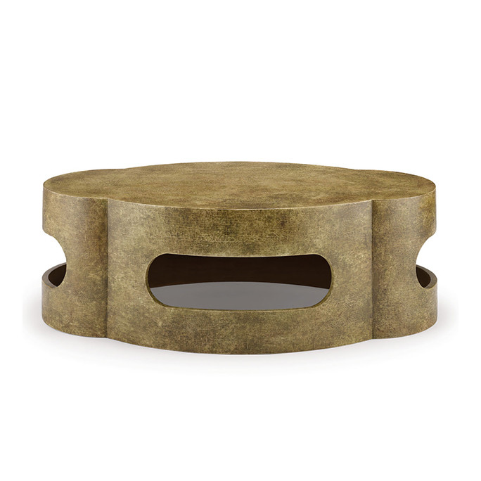 Description : Linen wrapped oval coffee table with four cut outs.