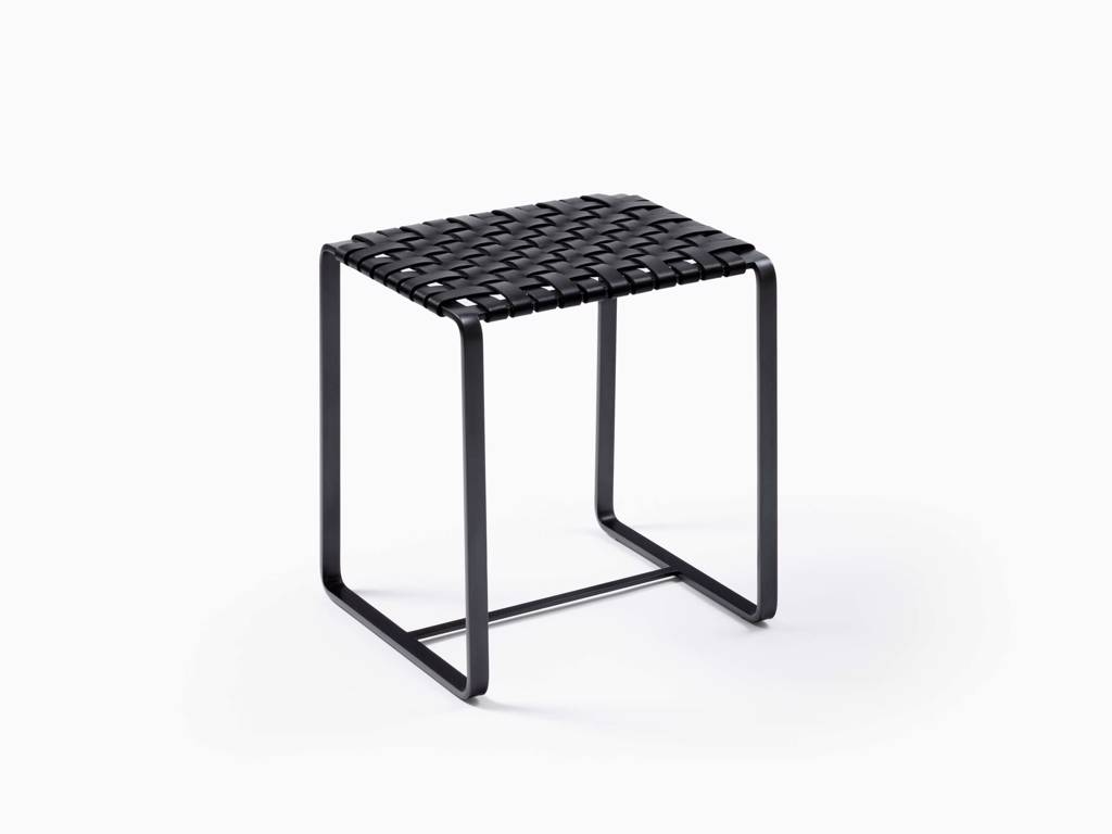 The Small Stool is a multi-functional piece that can serve as extra seating in the dining room or as a small table. A seamless, solid steel or stainless steel frame supports a hand-woven English Bridle leather seat.