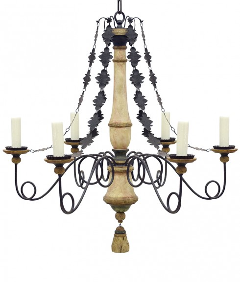 43”dia x 42”hsix lights ul approved for indoor usestandard size only350 bspatinated gilt iron with antique limed wood