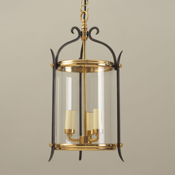 This small, elegant lantern has a circular, brass frame with curved legs and a coronet in bronze.Brass