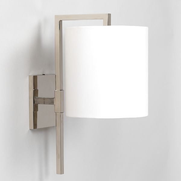 This wall light is defined by its clean, architectural lines. The square arm complements the suspended rectangular backplate, which hangs lower than the lampshade.