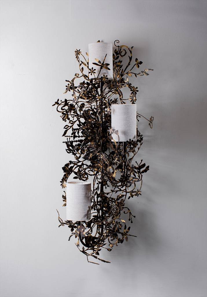 Organic and impactful, the Spry wall light has been developed into a larger-scale piece. The design of the Spry wall light takes inspiration from nature, including the forms of dried plants and flower heads. Created from laser-cut aluminium and a hand-formed metal frame.