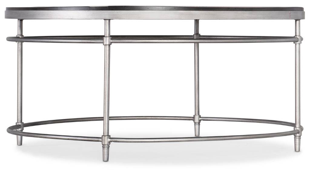 Product Description: Minimalist and modern, the St. Armand round cocktail table is filled with character. Crafted of Acacia Solid Wood in a black rustic finish, it features a lightly-scaled metal base with spherical stretchers at the top and bottom in brushed pewter metal. From outside leg to outside leg, the table measures 37 inches wide.